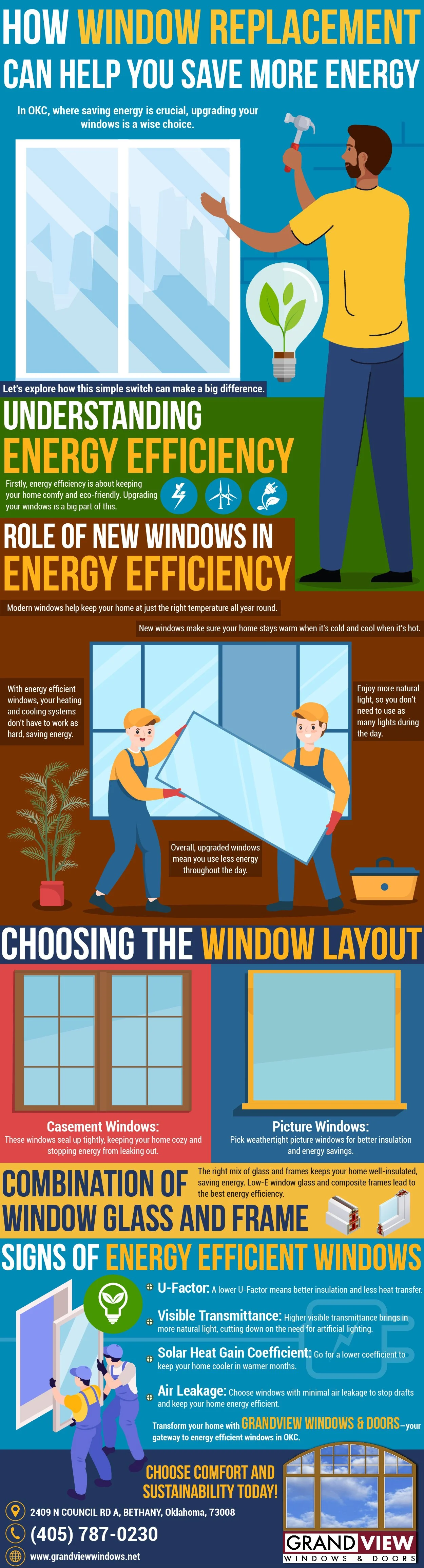 Upgrade your home by replacing your old windows. Boost comfort by maintaining a consistent indoor temperature, reducing stress on your HVAC system, and welcoming natural light. Our guide covers choosing the right window layout, the importance of Low-E glass and composite frames, and how to identify energy efficient windows. See the key factors like U-Factor, Visible Transmittance, Solar Heat Gain Coefficient, and Air Leakage. Make the smart choice for sustainable living with energy efficient windows in OKC, ensuring a more comfortable and cost-effective home.